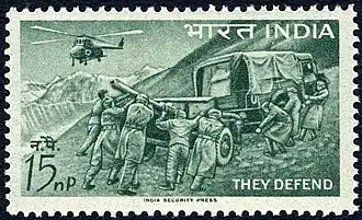 Commemorative stamps have been released were released by India Post depicting field artillery, a gunner and howitzer from Mountain Battery on the Golden Jubilee of the Regiment of Artillery and on the 50th anniversary of the 9 (Parachute) Field Regiment.[21][22][23]