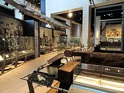 During the thematic development and design of the building in 1998, Ralph Appelbaum Associates were brought in to develop the three level concept of exhibit space.[4] Ralph Appelbaum Associates and museum staff came to the consensus that the museum's three distinct missions, art, culture, and science, must be represented dynamically.[15] Appelbaum's core concept for the division of Indiana's story would evolve as visitors traveled upward through the museums three floors.[4] Thus, the ground floor would host the ancient prehistory and natural history story, the second floor would tell the story of the material culture, industrial and cultural history, of the things made in Indiana and who made them, and the third floor would host the art galleries featuring Indiana's art and artists on a rotation.[4]