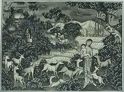 Paintings from the story of the Mahabharata. Drona tried to get rid of Bhima by telling him to meditate on Mount Kailasa -
