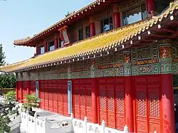 At the centre of the temple is the Main Gracious Hall. Beneath its Northern imperial Chinese exterior of gold and red is a Western structural frame of concrete and steel. It houses five great Buddha and Bodhisattva statues. The statue of Buddha Sakyamuni is the largest in North America.[2] The building contains a gift shop.