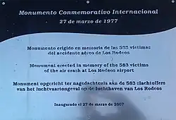The International Tenerife Memorial March 27, 1977, erected in memory of the 583 victims of the Tenerife airport disaster, is a monument located on the Mesa Mota on the outskirts of the city of San Cristóbal de La Laguna on the island of Tenerife (Canary Islands, Spain). This location has views of Los Rodeos airport (now Tenerife North Airport) and even, on clear days, the silhouette of Mount Teide.