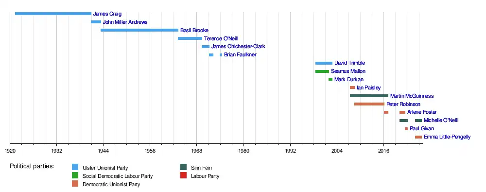 5 June 2008 | 11 January 2016 | 7 years, 220 days | Democratic Unionist Party | 2011 | Second Executive (2008–2011) Third Executive (2011–2016) |