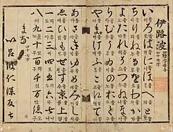 The work begins with four forms of the Japanese syllabary, each in the order of the Iroha poem: hiragana, two forms of mana (cursive Chinese characters), and katakana. Each hiragana syllable is accompanied by a transcription of its sound using Hangul.[3]