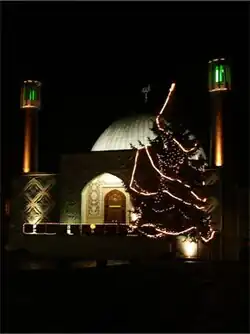 Mosque exterior decorated with Christmas lights and a Christmas tree during the Christian season of advent