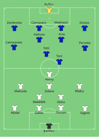 Italian defender Marco Materazzi was involved in all three outstanding moments of the first 120 minutes: He conceded the penalty that was converted by Zinedine Zidane early in the game, equalised with a powerful header soon after, and provoked Zidane in a manner that lead to the French captain being sent off. He also scored in the penalty-shootout that was to follow.