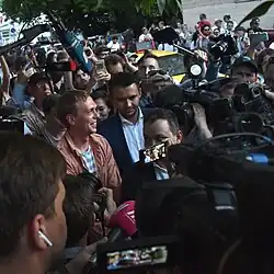 On 7 June 2019, Golunov was arrested by Moscow City Police on drug-related crime charges.[21] Colleagues and friends of Golunov expressed their belief that the case was fabricated and charges were primarily motivated by Golunov's investigations into corruption.[22] Those publicly speaking in defense of Golunov included Alexei Navalny,[23] Vladimir Posner,[24] Yuri Shevchuk,[25] Zemfira,[26] Alexey Venediktov,[27] Victor Matizen,[28] Victor Shenderovich,[29] Anna Narinskaya,[29] Ksenia Sobchak,[30] Boris Grebenshchikov,[31] Dmitry Muratov,[27] Andrey Zvyagintsev,[32] Leonid Parfyonov,[33] Grigory Yavlinsky,[34] Oxxxymiron,[35] and a number of other journalists, artists, and public figures.[36] Three major Russian newspapers, Kommersant, Vedomosti and RBK, published a joint editorial under the headline "I am / We are Ivan Golunov".[37]