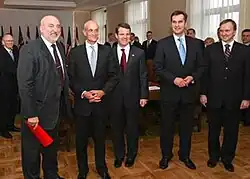 Godmanis served as prime minister from 1990 to 1993, focusing primarily on Latvia's difficult economic transition from planned to market economy. In 1995 Godmanis was awarded the Order of the Three Stars.[1] He later served as the Minister of Finance from 1998 to 1999.[2] He was originally associated with the Latvian Popular Front, but after the Front ceased to exist he moved to the Latvian Way party. In November 2006, following elections in which the Latvian Way in coalition with Latvia's First Party returned to Parliament, Godmanis became the Minister of the Interior.