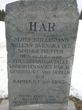 To stop the Norwegian advance, Georg Carl von Döbeln was sent out with a battalion of the Hälsinge Regiment to Jemtland, at the same time an additional battalion from Gävle was sent off against Härjedalen and reinforcements later arrived from the Life Grenadier Regiment and the Kalmar Regiment.[6] However, on 16 July the advancing Norwegian army captured the Hjärpe entrenchment which just had been abandoned by a Swedish force of 200 men under Colonel Theodore Nordenadler. Soon afterwards the Norwegians also captured the villages of Mörsil and Mattmar. But when a rumor that Sweden and Russia had started peace negotiations reached the Norwegian army, von Krogh chose to retreat and instead direct his attack against Härjedalen. On 24 July the Swedish force of 900 men under von Döbeln and the 1,800 Norwegian soldiers met at Härjedalen, the Norwegians force was defeated and had to retreat. An armistice was written the following day at Bleckåsen in Alsens.[7] One condition was that all the Norwegian troops would leave Sweden by 3 August, which also happened.[6]