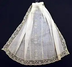 In the 17th and 18th centuries, a jabot consisted of cambric or lace edging sewn to both sides of the front opening of a man's shirt, partially visible through a vest/waistcoat worn over it. This style arose around 1650. Jabots made of lace and hanging loose from the neck were an essential component of upper class, male fashion in the baroque period.