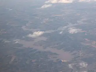 In 1911, the Lloyd Shoals Dam project was completed at 100 feet tall and 1,070 feet of concrete masonry.[2][4] Transmission lines were erected to extend power to substations in Macon, Forsyth, Griffin, Barnesville, rural Bibb County, and extending to Jackson.[4] The basin was slow to fill, creating pools of stagnant water favorable to the growth of mosquitoes. This, in turn, led to an outbreak of malaria which drove away additional locals who had not initially been displaced by the project.[2] Even after the lake filled to full pool, and for some time thereafter, it was red and muddy from erosion along the clay shoreline.[2] The electrification of Jackson, and rural Butts County led to economic expansion when new industry was attracted to the area. Among the new businesses were several soft drink bottling plants and the Jackson Ice Corporation (1920).[5]