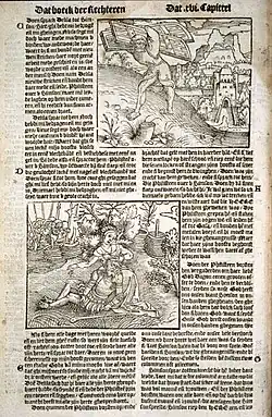 The title page of the 1526 edition shows various biblical characters such as Moses, Joshua and David and the evangelists Mark and John.[3] It also contains a plea for the Bible for the people, which is expressed through a selection of bible texts. Van Liesvelt probably had the Cologne edition of the first Bible in Low German of 1478–79 in mind in the execution and design.[12] The Liesvelt Bible was illustrated with woodcuts, several of which are attributed to the Dutch engraver Jan Swart van Groningen and copies of German woodcuts. Swart was active in Antwerp from 1523. For his Bible illustrations he relied heavily on the prints in Luther's Pentateuch printed in Wittenberg in 1523.[3]