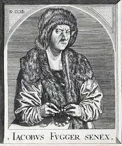 Jakob Fugger of the Lily (German: Jakob Fugger von der Lilie; 6 March 1459 – 30 December 1525), also known as Jakob Fugger the Rich or sometimes Jakob II, was a major German merchant, mining entrepreneur, and banker. He was a descendant of the Fugger merchant family located in the Free Imperial City of Augsburg. He was born and later also elevated through marriage to Grand Burgher of Augsburg (Großbürger zu Augsburg). Within a few decades, he expanded the family firm to a business operating in all of Europe. He began his education at the age of 14 in Venice, which also remained his main residence until 1487. At the same time, he was a cleric and held several prebends. Even though he lived in a monastery, Jakob found time to study the history of investment in early Asian markets. American journalist Greg Steinmetz has estimated his overall wealth to be around $400 billion adjusted to 2015, equivalent to 2% of the GDP of Europe at that time.[a][1][2]