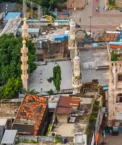 The mosque is an important example of early Qutb Shahi architecture, and displays Mughal influences in its design.[7] Situated to the northeast of the Charminar, it is surrounded by haphazardly constructed shops which encroach upon the mosque.[8][9] It is accessible through a portal of the pillar-and-lintel form, consisting of an entrance arch, upon which a cusped arch is superimposed. The portal leads to a narrow lane, from which one approaches the side of the mosque from the west, and this is an unusual feature of the mosque.[10] The mosque stands at the western end of a paved rectangular courtyard, which measures approximately 23 by 21 metres (74 by 70 ft). The courtyard contains a cistern at its north-eastern end, as well as a hammam, which is now in ruins. A narrow colonnade runs along the northern side of the courtyard. It is built in the pillar-and-lintel form, and consists of nine openings.[9]