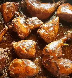 Chinese labourers, mostly Hakka,[52][58] who arrived during indentureship also contributed to Jamaican cuisine. Chinese (especially Cantonese) influences can be found in dishes with pak choy, mushroom and mustard.[18][59] Upon arrival many of the original ingredients used in China were not available, and they were imported later, so the Chinese had to improvise and adapt in order to recreate their dishes[59]— as such, Jamaican Chinese food emerged. In the 1940s, Jamaican tamarind was substituted for Chinese sour plums, key ingredients in the preparation of a popular Chinese duck dish.[59] Their most notable culinary contributions are hard dough bread[60] and the use of soy sauce, ginger and escallion on meats,[18][59] particularly in Jamaican brown stew and fricassee dishes. They also influenced other Jamaican fusion dishes, and contributed stir-fry, chow mein, chop suey, fried rice, sweet and sour meats/seafood, pineapple chicken and others[18]— which can be found on the menus of non-Chinese local restaurants. In Jamaica, many Chinese restaurants have their own variations of Chinese dishes, modified with a local twist,[59] like "Jamaicanized" fried rice with saltfish. Commonly prepared local Chinese dishes include Jamaican malah chicken, pork with muknee or hamchoy, hot pepper chicken (pork, beef and shrimp), Chinese five-spice roast meats, sui/suey mein, lo mein, "2 or 3 meat choy fan" (which includes a combination of dishes), Chinese-style curry chicken, meats cooked in black bean sauce,[18] shrimp, chicken or beef broccoli and others. They have also contributed condiments like oyster sauce, hoisin sauce, sweet and sour sauce,[59] satay sauce and scotch bonnet-infused soy sauce, sesame oil[59] and various noodles.[18] Jamaican twist donut (a variation of mahua) and moon cake are of Chinese origin.[61][62]