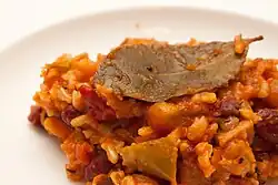 Jambalaya (/ˌdʒæmbəˈlaɪə/ JAM-bə-LY-ə, /ˌdʒʌm-/ JUM-) is a savory rice dish that developed in the U.S. state of Louisiana fusing together African, Spanish, and French influences, consisting mainly of meat and/or seafood,[1] and vegetables mixed with rice and spices. West Africans and Spanish people each had versions of jambalaya in their respective countries. Historian Ibraham Seck states Senegalese people were making jambalaya. The French introduced tomato to West Africans and they incorporated the crop into their one-pot rice dishes that created jambalaya and enhanced jollof rice. Spanish people made paella which is also a one-pot rice dish cooked with meats and vegetables. These styles of cuisines blended in Louisiana and resulted in cultural and regional variations of the dish.