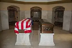 The caskets of the President and Lucretia Garfield lie in a crypt on full display beneath the memorial, along with the ashes of their daughter (Mary "Mollie" Garfield Stanley-Brown [1867–1947]) and son-in-law Joseph Stanley Brown.[16] Lucretia Garfield died on March 13, 1918, and was interred in the Garfield Memorial on March 21.[20]