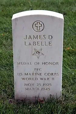 For conspicuous gallantry and intrepidity at the risk of his life above and beyond the call of duty while serving with the Weapons Company, Twentyseventh Marines, Fifth Marine Division, in action against enemy Japanese forces during the seizure of Iwo Jima in the Volcano Islands, 8 March 1945. Filling a gap in the front lines during a critical phase of the battle, Private First Class LaBelle had dug into a foxhole with two other Marines and grimly aware of the enemy's persistent attempts to blast a way through our lines with hand grenades, applied himself with steady concentration to maintaining a sharply vigilant watch during the hazardous night hours. Suddenly a hostile grenade landed beyond reach in his foxhole. Quickly estimating the situation, he determined to save the others if possible, shouted a warning and instantly dived on the missile, absorbing the exploding charge in his own body and thereby protecting his comrades from serious injury. Stouthearted and indomitable, he had unhesitatingly relinquished his own chance of survival that his fellow Marines might carry on the relentless fight against a fanatic enemy and, his dauntless courage, cool decision and valiant spirit of self-sacrifice in the face of certain death reflect the highest credit upon Private First Class LaBelle and the United States Naval Service. He gallantly gave his life in the service of his country.[2]