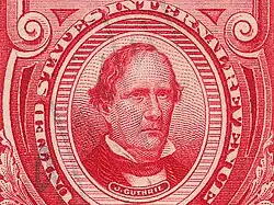 President Franklin Pierce recognized Guthrie's financial acumen and appointed him Secretary of the Treasury in 1853.[7] Soon, Guthrie became the most influential member of Pierce's cabinet.[7] A hard money Democrat, Guthrie opposed a national bank, as well as small distinctive notes issued by free and charter banks.[24] Instead, Guthrie advocated adoption of a universal currency that would be convertible to gold on demand.[24] In his first report, he criticized his predecessor, Thomas Corwin, for making private arrangements for debt repurchases.[24] He also accused Corwin of conspiring with a New York port master to under-report duties collected and deposit them into a trust.[16] Guthrie caused a brief public uproar by removing the port master from his post.[16]