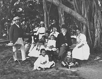 The Boyd, Robertson and Cleghorn families in front of the banyan tree at ʻĀinahau.