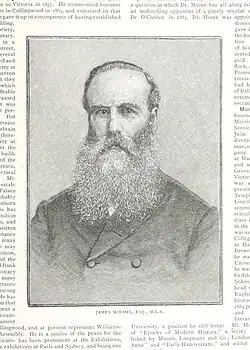 3. ^ a b c d e f Ingham, S.M. "Mirams, James (1839–1916)". Australian Dictionary of Biography. National Centre of Biography, Australian National University. ISBN 978-0-522-84459-7. ISSN 1833-7538. OCLC 70677943. Retrieved 27 December 2017.