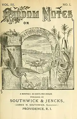 In 1894 the firm was sold off to Walter A. Angell and Harry A. Cash who renamed the store to Angell & Cash. Southwick then became a curator at the Roger Williams Park Museum in Providence in 1896. Here he set up a collection of the birds of the region which he called the "Rhode Island Room" and also took a special interest in applied entomology. As State Entomologist and member of the Tree Protection Society he took a special interest in gypsy moths, elm leaf beetles and the San Jose scale which were threats to the local trees and crops. He was also a member of other groups including the Audubon Society, the Tree-Protection Society, the Rhode Island Horticultural Society and St. John's AF & AM Lodge. Suffering from poor health he went to Rhode Island Hospital on May 26, 1904, and died of heart failure on June 3.[1][2][3]