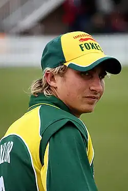 Taylor played for Leicestershire against the West Indies as part of their 2009 tour of England but struggled, recording scores of just four and five in a drawn three-day match.[25] Taylor was selected to play in his first County Championship match of 2009 against Middlesex on 28 April. In the second innings he scored his maiden first-class century, in his seventh game scoring 122 not out to help save the match and earn a draw.[26] He followed this with a Man-of-the-Match performance in Leicestershire's victory in the Friends Provident Trophy against Worcestershire on 12 May. Taylor achieved his maiden one-day century, scoring 101 before being run out by Matthew Mason.[27] This performance garnered much media attention and saw him become Leicestershire's youngest ever player to score a one-day century, taking the record from former England and Leicestershire player David Gower.[28] Leicestershire missed qualification for the second round of the 2009 Twenty20 Cup by one point. In ten matches, Taylor scored 205 runs with a highest score of 41 not out.[29] On 1 August Taylor scored an unbeaten double-century against Surrey, scoring 207 not out, spending seven hours at the crease, whilst sharing an unbeaten partnership of 230 runs with Jacques Du Toit who also made a century as Leicestershire declared on 593/5.[30][31] In the process Taylor became the youngest Leicestershire player to score a double-century.[32]