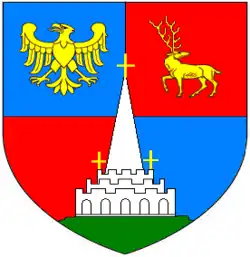 - ^ Arms as depicted in a 1794 stained glass image in Shute Church of the arms of George Templer of Shapwick. These differ in several details from the official grant of 1765 registered in the College of Arms: Quarterly azure and gules, on a mount in base vert the perspective of an antique temple argent of three stories, each embattled; from the second battlement two steeples, [sic] and from the top, one, each ending in a cross sable [sic] on the pinnacle; in the first quarter an eagle displayed; in the second a stag trippant regardant or.[1]