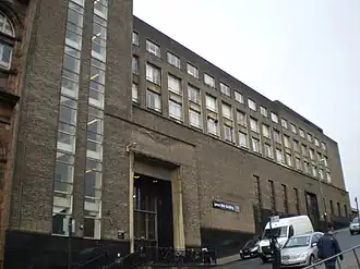 The James Weir Building was designed by Peter Williams of the local architectural firm Shanks, Wylie and Underwood (Williams later designed other prolific academic buildings in the area such as the Met Tower and the Central College of Commerce) and was constructed over the period 1956–1964 in two distinct phases as a north eastern extension to the Royal College Building, which allowed the expanded Royal College to attain the royal charter and become the University of Strathclyde.[3][4] The building was originally simply called the "Montrose Street Block", but later renamed to the James Weir Building in 1968 after one of the founders of G. & J. Weir Ltd, later known as the Weir Group[5]