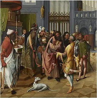 The Adoration of the Magi in the Pinacoteca is central to Jan de Beer's oeuvre. The work was completed in 1515 with the assistance of his thriving workshop. It has been suggested by an art historian that the two wing panels were entrusted by Jan de Beer to the so-called 'Master of Amiens', one of his best students.[9] This theory is not universally accepted.[4] The external sides of the wing panels depict the Annunciation in grisaille, the prologue of the scenes depicted inside. The work found its way to Venice where it may have been located in the convent of Santa Maria Maddalena delle Covertite alla Giudecca or the church of Santa Maria dei Servi. The triptych had previously been attributed to Albrecht Dürer, Lucas van Leyden and Herri met de Bles before it was returned to Jan de Beer by Friedländer.