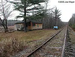 Jayville was a hamlet located in the southwest part of St. Lawrence County, New York, in the United States. The hamlet started as a mining community in 1850 on what eventually became the Carthage and Adirondack Railroad.[1] Its existence was short lived as its non-favorable mineral composition and difficult ore availability was abandoned in favor of neighboring Benson Mines, located 14 miles (23 km) down the railroad to the east.[2] After mining stopped in the community, other industries such as saw mills kept the population busy. Ultimately, these business were short lived. A further attempt to reopen the mines in 1914 failed and an eventual fire ended the existence of the hamlet of Jayville.[3] Today remnants of the hamlet can be found off the now abandoned railroad station located on New York State owned land[4] southeast of Harrisville on Jayville Road.