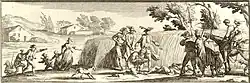 The body of Roland is found in a wheat field, by the road from Paris to Rouen. Engraving by Charles François Gabriel Levachez, circa 1799.