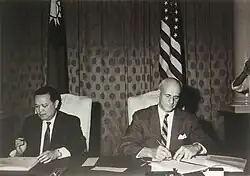 On October 24, Clark's mission returned to the Seraph and later met a seaplane that flew them back to Gibraltar, arriving back in London on October 25 where Wright briefed Admiral Stark.[41] Both Eisenhower and Clark recommended Jerauld Wright for a Distinguished Service Medal in recognition for his role in Operation Flagpole.[42] Wright's DSM was personally pinned by Admiral Ernest J. King, the Chief of Naval Operations, during the Casablanca Conference.[43]