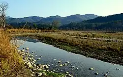 Jim Corbett National Park is located partly along Doon Valley between the Lesser Himalaya in the north and the Siwalik Hills in the south; it has a sub-Himalayan belt structure.[3] The upper tertiary rocks are exposed towards the base of the Shiwalik range and hard sandstone units form broad ridges.[3] Characteristic longitudinal valleys, geographically termed Doons, or Duns can be seen formed along the narrow tectonic zones between lineaments.[3] The elevation of the region ranges between 360 m (1,180 ft) and 1,040 m (3,410 ft).[3] It has numerous ravines, ridges, minor streams and small plateaus with varying aspects and degrees of slope.[3] The park encompasses the Patli Dun valley formed by the river Ramganga.[13] Its present area is 1,288.31 km2 (497.42 sq mi) including a 822 km2 (317 sq mi) core zone and 466.31 km2 (180.04 sq mi) of buffer area.[14]