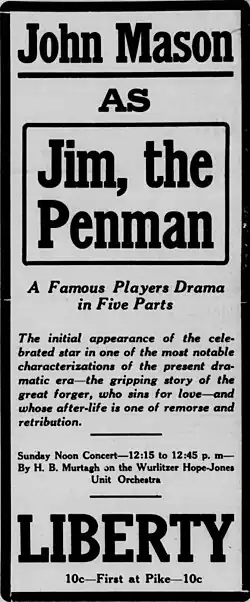 Jim the Penman is a 1915 silent film crime drama produced by the Famous Players Film Company and released through Paramount Pictures. It was the first movie based on a well-known stage play, Jim the Penman by Charles Lawrence Young, about a forger in Victorian Britain. The film was directed by Edwin S. Porter and starred stage actor John B. Mason in his debut film, in line with Adolph Zukor's efforts to recruit famous stage actors for films. Mason had played the part on the stage in the 1910 season on Broadway.[1] Co-starring with Mason was the young up-and-coming favorite Harold Lockwood.