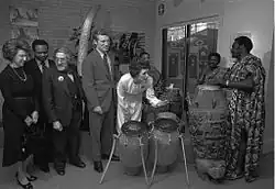 Mondale playing the drums after a press conference at the National Museum of African Art with, (l–r), Rep. Lindy Boggs, Rep. Walter E. Fauntroy, Warren M. Robbins (founder of the museum), and Sen. Wendell Anderson, 1978