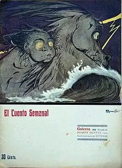 Cover of the short novel La Galerna (1908) published in El Cuento Semanal. The cover is illustrated by Romero Calvet, while the story features inside illustrations by Estevan.