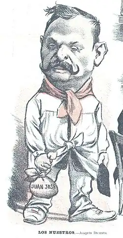 A 1902 caricature by Manuel Tovar depicting Dicenta while holding a bag reading Juan José