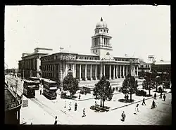 Sixty metres from the main entrance on Rissik Street is a small stone paved square originally with flower boxes.[3]: 248 During the Civic Spine project of 1989–91, Rissik Street between the City Hall and The Post Office was bent in front of the square to accommodate a fountain and obelisks in the centre of the road.[3]: 241 Granite steps lead up to the entrance consisting of a colonnaded portico along the full front of the building and with a central domed tower above.[3]: 248 The entrance vestibule of marble and mosaics had corridors leading left and right to municipal departments while a marble staircase lead up to the first floor which consisted of the council chamber, committee rooms, councillor's library and lobby with Mayor's parlour facing the square.[3]: 248–9 The council chamber was domed with ornamental plaster and oak finishes with the committee rooms with a similar finish.[3]: 249 On the ground floor below the council chamber was the Rates Hall which was accessed from the north and south sides of the building in President and Market Streets.[3]: 249 The building originally had an open courtyard in the centre.[3]: 249
