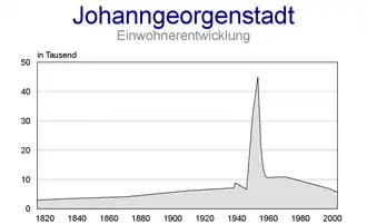 Johanngeorgenstadt (German pronunciation: [ˌjoːhan.ɡeˈɔʁgŋ.ʃtat] , lit.'John George Town') is a mining town in Saxony’s Ore Mountains, 17 km south of Aue, and 27 km northwest of Karlovy Vary. It lies in the district of Erzgebirgskreis, on the border with the Czech Republic, is a state-recognized health resort (Erholungsort), and calls itself Stadt des Schwibbogens (“Schwibbogen Town”). Its population decline since the 1950s has been extremely severe, falling from 45,000 residents in 1953 to only about one twelfth of that now.