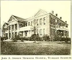 After being given to the Tuskegee Institute in 1911, it was dedicated on February 21, 1913, as a result of which it was renamed. It was rebuilt using money donated by the wife of Charles E. Mason, a trustee of the Tuskegee Institute. It was named after Mrs. Mason's grandfather, former Massachusetts governor John Albion Andrew.[4] In a 1919 article in the Nation's Health, Kinney described the hospital as "a modern, up-to-date, well-appointed, two-story brick building, with accommodations for sixty patients with no crowding, and for a good many more when it is necessary."[5] The Tuskegee Syphilis Study took place at the hospital, thanks to the approval of both Eugene Dibble (then the hospital's medical director) and Robert R. Moton (then the president of the Tuskegee Institute).[6][7]