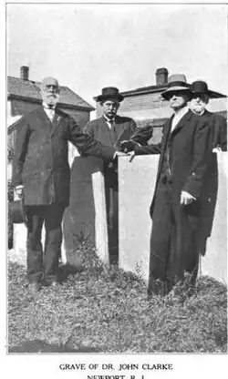 Clarke believed that secular government should peacefully coexist with religion, and he became a seminal figure in applying the separation of church and state.[89] Historian Thomas Bicknell, one of Clarke's most ardent supporters, wrote that at the time of the Puritan settlement of New England that "nowhere on the face of the earth and among civilized men, did civil and soul-liberty exist. Its first clear, full, deliberate, organized and permanent establishment in the world can now be distinctly traced to the Colony of Rhode Island, on the island of Aquidneck, in the Narragansett Bay, under the leadership and inspiration of Dr.[b] John Clarke, the true Founder".[90] Historian Louis Asher wrote, "It hardly seems arguable that Dr. Clarke was the first one to bring democracy to the New World by means of Rhode Island."[91] Bicknell also asserted that Clarke was the "recognized founder and father of the Aquidneck Plantations, the author of the Compact of Portsmouth and leading spirit in the organization and administration of the island towns.[7] Historian Edward Peterson wrote that Clarke was a man "whose moral character has never been surpassed, and his piety never been questioned."[92] Asher made this final assessment of Clarke: "As a man, Clarke lived for others. Like many men of the past, he was selfless and uncomplaining. Despite his sectarian religious views, he gave more for his fellow man than he received."[93]
