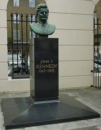 A 1965 memorial bust of John F. Kennedy by Jacques Lipchitz stands in the lobby of International Students House on Great Portland Street in London, England,[1] and is visible from the outside through the glass doors. It was moved there in April 2019 from its original location on the Marylebone Road,[2] to the west of Great Portland Street underground station, after it was vandalised in 2017.[3][4]