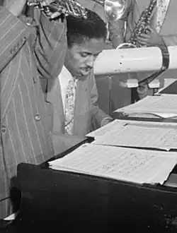 Once Lewis moved to New York, Clarke introduced him to Dizzy Gillespie's bop-style big band. He successfully auditioned by playing a song called "Bright Lights" that he had written for the band he and Clarke played for in the Army.[11] The tune he originally played for Gillespie, renamed "Two Bass Hit", became an instant success.[12] Lewis composed, arranged and played piano for the band from 1946 until 1948 after the band made a concert tour of Europe.[4][11] When Lewis returned from the tour with Gillespie's band, he left it to work individually. Lewis was an accompanist for Charlie Parker and played on some of Parker's famous recordings, such as "Parker's Mood" (1948) and "Blues for Alice" (1951), but also collaborated with other prominent jazz artists such as Lester Young, Ella Fitzgerald and Illinois Jacquet.[4]
