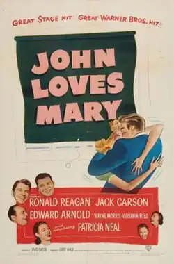 John Loves Mary is a 1949 comedy film directed by David Butler and written by Henry Ephron and Phoebe Ephron. The film stars Ronald Reagan, Patricia Neal and Jack Carson.[4] The film was released by Warner Bros. on February 19, 1949. It's based on a Broadway play of the same name written by Norman Krasna, which ran from February 4, 1947, to February 7, 1948, at the Booth Theatre and Music Box Theatre in New York City.[5]
