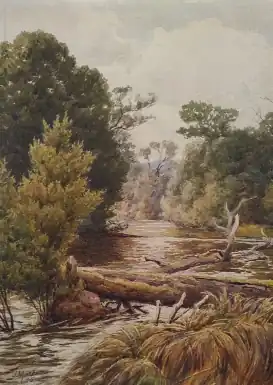 His early interest in the landscape around Heidelberg is demonstrated by Wattles at Heidelberg and Leaving off Work, Heidelberg Road, both exhibited with the Victorian Academy of Arts in 1881.[47] He exhibited the following year, Near the Yarra, Heidelberg and Stubble Field, Heidelberg. Another example is a water colour of bushland and river The Yarra at Heidelberg, signed and dated 1882.[48]