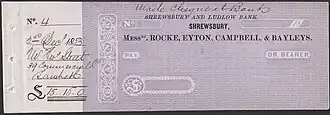 See also: "Shrewsbury & Ludlow Bank (Rocke, Eyton, Campbell & Bayley) bank note". Spink. Archived from the original on 2023-10-22. Retrieved 2023-10-22. On this page an issue of Rocke, Eyton, Campbell & Bayley is shown.