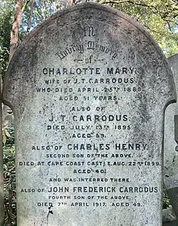 He died at Hampstead, London on 13 July 1895[3] and was buried in a family grave on the eastern side of Highgate Cemetery.