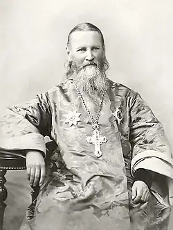 John of Kronstadt or John Iliytch Sergieff[3] (pre-reform Russian: Іоаннъ Кронштадтскій; post-reform Russian: Иоа́нн Кроншта́дтский; 31 October [O.S. 19 October] 1829[a] – 2 January 1909 [O.S. 20 December 1908]) was a Russian Orthodox archpriest and a member of the Most Holy Synod of the Russian Orthodox Church. He was known for his mass confessions, numerous miracles,[4] and charitable work, as well as his monarchistic and anti-communist views.[5][6][7][8][9][10][11][12][13][14]