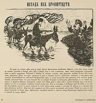 The escape of John of Kronstadt, who is met by Mikhail Krivoshlyk in St. Petersburg. Magazine «Pulemet» № 1. (1905), caricature. New York Public Library, signature above the image:,[25] signature under the image:[26]