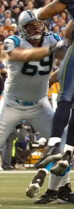 Gross started every game for the Panthers that season at right tackle, and in fact did not miss a single offensive play, a rarity for many veterans, much less rookies. He allowed only three sacks all season, and was an anchor on the offensive line that sent the Panthers to Super Bowl XXXVIII. He made the Pro Football Weekly All-Rookie and Sports Illustrated All-Pro teams that season. Due to retirements and personnel shifts, Gross moved from right tackle to left tackle for the 2004 NFL season; he and center Jeff Mitchell were the only two returning starters on the offensive line that season. The instability on the line was one of many problems for the Panthers, who were plagued with injuries, and they finished the season 7–9. The following year, he moved back to right tackle, and the Panthers' starters remained the same during the entire season. On February 19, 2008, the Panthers named Gross their franchise player and placed the franchise tag on him giving him a one-year $7.45 million deal.[5] This later proved to be a good move, as he was voted to the 2009 Pro Bowl.[6] On February 19, 2009, the Panthers would sign Gross to a six-year contract, making him one of the highest-paid offensive lineman in the NFL.[7] In a matchup against the Atlanta Falcons on November 15, 2009, Gross broke his ankle, landing him on the injured reserve list and ending his participation in the 2009 NFL season.[8] He was ranked 87th by his fellow players on the NFL Top 100 Players of 2011.[9]